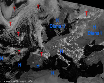 Auf dem heutigen Satellitenbild sind sowohl im Mittelmeerraum als auch über Skandinavien und Westrussland ausgeprägte Hochdruckgebiete zu erkennen, die in diesen Regionen für meist heiteres Wetter mit nur ganz vereinzelten Gewittern sorgen. Von der Biskaya über Frankreich bis in den Osten Europas kann es bei meist nur schwachem Hochdruckeinfluss oder leichtem Tiefdruckeinfluss teils zu starker Wolkenbildung und zu teils kräftrigen Schauern oder Gewittern kommen. Häufig bleibt es aber auch hier trocken.