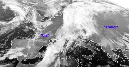 Auf dem Satellitenbild von Samstag früh ist ein dichtes Wolkenband von der Ostsee über Polen und Ostdeutschland bis ins Mittelmeer gut zu erkennen. Es ist der Ausläufer eines Tiefs über Südskandinavien der heute noch für zum Teil regnerisches Wetter im Osten und Süden Deutschlands gesorgt hat. Hinter diesem Ausläufer ist der Himmel fast wolkenfrei. Des weiteren sorgen zwei Hochdruckgebiete ('Traudl' und 'Ute') für freundliches und wolkenarmes Wetter.