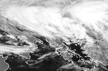 Das Frontensystem von Tief 'Bertrand', mit seinem Zentrum über Bulgarien, reicht von Norditalien längs der Adria nach Griechenland, und weiter bis in die Ukraine. Auf seiner Rückseite strömt kalte Polarluft in das Tief hinein, dass sich somit noch verstärken kann und für kräftigen Schneefall und zum Teil starken Wind in den Balkanländern sorgt.