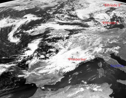 Das Tief 'Elfriede' mit seinen zwei Zentren über Skandinavien lenkt heute Mittag in einer kräftigen westlichen Strömung einige Wolken über die Britischen Inseln, die Nordsee und über Skandinavien hinweg. Hierbei kommt es zu Regen oder Schauern. Über Nordspanien und Südwestfrankreich erkennt man die Wolken des neuen Tiefs 'Friederike', das auf dem Weg über dem Mittelmeer und wieder nach Norden am Freitag viel Regen nach Südostdeutschland bringt. Im meteorologischen Sinne spricht man dabei von einer Vb-Wetterlage, benannt nach dem Meteorologen van Bebber(1841-1905). Eine ähnliche Wetterlage sorgte im Sommer 2002 für das Elbehochwasser. (Bildquelle: Copyrigt EUMETSAT, NERC Satellite Receiving Station, University of Dundee)
