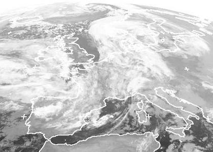 Auf dem Satellitenbild erkennt man über Deutschland meist starke Bewölkung. Sie gehört zu Tief 'Ernst' über Südskandinavien. Auf der Rückseite seiner Kaltfront ist jedoch ein Gebiet mit geringer Bewölkung zu erkennen, das sich von den Britischen Inseln nähert. Von Westen ziehen dahinter aber schon wieder neue Regenwolken auf. Sie gehören zum Atlantiktief 'Dieter' und werden morgen unser Wetter bestimmen.