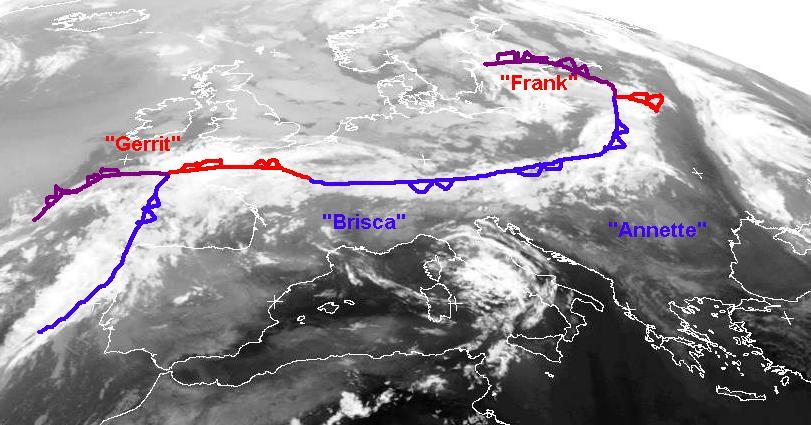 Während es in Nordwesteuropa weiter wechselhaft und teilweise noch kühl bleibt, sorgt Hochdruckeinfluss im Süden und Südosten für viel Sonnenschein und ansteigende Temperaturen. Auf dem Satellitenbild vom Dienstagmorgen liegt das Tief 'Frank' über Südschweden, man erkennt sehr gut sein Frontensystem (die Kaltfront erstreckt sich vom Baltikum über Polen und Süddeutschland bis nach Frankreich und ist hier mit dem Frontensystem des neuen Tiefs 'Gerrit' über dem Ärmelkanal verbunden, die Warmfront liegt über Weißrussland). Auf dem Balkan sorgt das Hoch 'Annette' für fast wolkenlosen Himmel