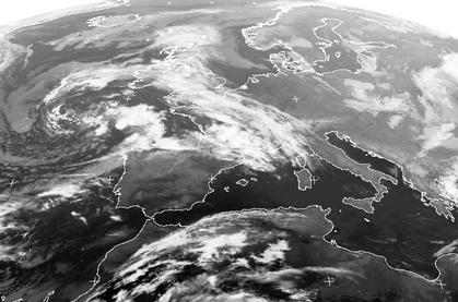 Das Satellitenbild zeigt ein Tief bei den Azoren, das im gesamten Westen Europas Wolken und zum Teil Gewitter hervorbringt. Nach Nordosten bestimmt ein Hoch über Skandinavien das Wetter mit viel Sonnenschein. Über Osteuropa zeigen sich die Wolken eines schwachen Kaltluftvorstoßes durch ein Tief über dem Westen Rußlands.