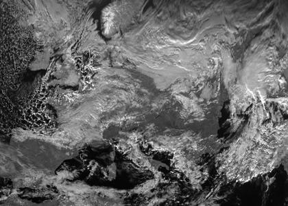 Tief 'Irmi' sorgt für dichte Wolken in Mitteleuropa. Auch über den Britischen Inseln und Frankreich herrscht meist Tiefdruckeinfluss vor. Freundlicher ist es unter Hochdruckeinfluss auf der Iberischen Halbinsel und im Süden Norwegens. Hier sind deutlich die verschneiten Berge der Skandinavischen Halbinsel zu sehen.