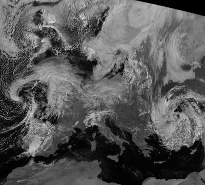 Südwestlich von Irland befindet sich das Zentrum von Tief 'Kerstin', dessen Warmfrontbewölkung ganz Großbritannien in dichte Wolken hüllt. Im Süden Frankreichs, im Norden Spaniens sowie in Italien macht sich schwacher Zwischenhocheinfluss bemerkbar, hier ist es wolkenarm und der Blick auf die noch verschneiten Gebirge wird frei. Ost- und Nordeuropa liegen im Bereich der Tiefs 'Ingeborg' und 'Judy'. Über dem Schwarzen Meer ist ebenfalls ein ausgeprägtes Tief erkennbar.