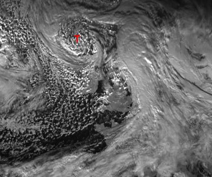 Der Wolkenwirbel nordwestlich von Irland gehört zu dem Sturmtief 'Ronny'. Seine Kaltfront erstreckt sich von der Nordsee bis in den Norden Frankreichs und bringen teils kräftigen und schauerartigen Regen. Auf dem Atlantik bilden sich auf der Rückseite der Kaltfront Schauerwolken.