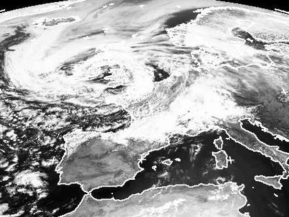 Das Tief 'Tomina' über den Britischen Inseln liegt im Zentrum eines über Westeuropa und dem Ostatlantik weit ausgedehnten Wolkenwirbels. Ein Ausläufer mit dichten Wolken erstreckt sich von Südfrankreich in die Südosthälfte Deutschlands. Westlich davon erkennt man auf dem Satellitenbild vom Sonntagmittag eine Zone mit meist nur lockerer Bewölkung.