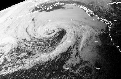 Ein Tief mit ausgeprägter Spiralform liegt über dem Nordpazifik vor der nordamerikanischen Küste. Während auf seiner Vorderseite niedrige Bewölkung liegt, bildet sich auf der Rückseite schauerartige Bewölkung.