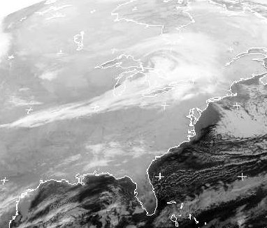 Nördlich der Großen Seen liegt das Zentrum eines Tiefs, dessen Kaltfrontbewölkung sich südwestwärts bis nach Texas erstreckt. Die Kaltfront zieht weiter südostwärts. Dahinter strömt zunehmend kältere Luft nach Süden. So ist auch in New York in der Nacht zum Freitag Frost und etwas Schnee zu erwarten. (Bildquelle: NERC Satellite Receiving Station, Dundee University, Scotland, http://www.sat.dundee.ac.uk/)