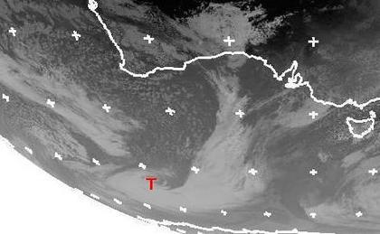 Die Ausläufer eines Tiefs über dem Südmeer reichen bis in den Südwesten Australiens. Auf dem Satellitenbild von Samstag früh sind die Schauer, die sich in den kühleren Luftmassen hinter der Kaltfront bilden gut zu erkennen. (Bildquelle: NERC Satellite Receiving Station, Dundee University, Scotland, http://www.sat.dundee.ac.uk)