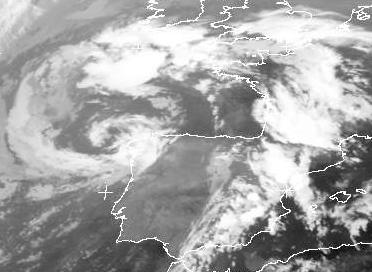 Die Wolkenspirale gehört zu Tief 'Yassin' mit seinem Zentrum in der westlichen Biskaya. Aus Süden zieht es sehr warme Luftmassen heran, die auf etwas kühlere aus dem Norden Treffen. An dieser Luftmassengrenze kommt es zu teils kräftigen Schauern und Gewittern, heute über Frankreich und Südengland.