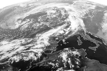 Das Satellitenbild einen ausgedehnten Tiefdruck-Komplex über dem Atlantik, der das Wetter im gesamten Westen und Teilen der Mitte Europas bestimmt. Nach Süden und Osten schließt sich eine wolkenarme Zone an die zu einer schwachen Hochdruckbrücke gehört. In Dalmatien hat sich Nebel gebildet. Dort fiel Tags zuvor Regen und mit einer nördlichen Strömung mischte sich etwas kältere Luft dazu.