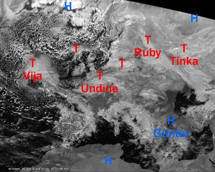 Auf dem Satellitenfoto von heute Nachmittag sind eine Reihe von Tiefdrucksystemen über Europa zu erkennen. Bei meist wechselhaften Wetter bilden sich von der Iberischen Halbinsel bis in den Süden Englands häufig Schauer, teils sind auch Gewitter möglich. Von England weiter nach Benelux, Deutschland und nach Osteuropa bringen viele Wolken zeitweise Regen, nach Nordosten auch Schnee. Deutlich freundlicher ist es unter Hochdruckeinfluss in Südosteuropa.