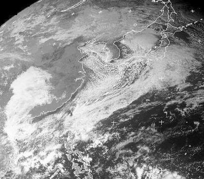 Über Japan liegt das Zentrum eines Tiefdruckgebiets. Ein Wolkenband, das zu seinem Frontensystem gehört, erstreckt sich über dem Pazifik bis nach Taiwan. Auf seiner Rückseite strömt kalte Luft vom asiatischen Festland auf das Japanische (Koreanische) Meer, das Gelbe Meer und das Ostchinesische Meer. Über dem Wasser bildet sich Schauerbewölkung. In China ist es unter Hochdruckeinfluss zum Teil wolkenlos. Im Süden erkennt man aber ein ausgedehntes Gebiet mit Nebel oder Hochnebel.