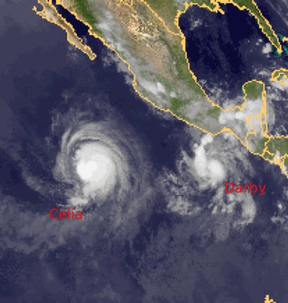 Über dem Pazifik, in deutlichem Abstand südwestlich der mexikanischen Küste liegt der Hurrikan 'Celia'. Er erreicht in Böen derzeit Windgeschwindigkeiten bis zu 180 km/h. Der Hurrikan zieht jedoch weiter über den offenen Ozean nach Westen. Weiter östlich, noch näher an der Küste, entwickelt sich derweil der neue tropische Wirbelsturm 'Darby' mit Spitzböen von derzeit bis zu 100 km/h. Er wird sich noch weiter verstärken und nach letzten Berechnungen kaum weiter westwärts bewegen, seine Zugbahn ist noch sehr unsicher. Damit könnte er möglicherweise zu einer Bedrohung für die Küstenregion werden.