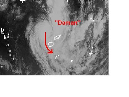 Das Satellitenbild von Donnerstag früh zeigt den Tropensturm 'Daman' bei den Fidschi-Inseln. Zurzeit erreicht er mittlere Windgeschwindigkeiten von 102, in Böen 139 km/h. Berechnungen zufolge soll er sich nur noch wenig verstärken, und weiter nach Süden ziehen. Dabei liegen die Fidschi-Inseln in seinem Einzuggebiet. Hier kommt es zu kräftigen und ergiebigen Regenfällen und Sturm. (Bildquelle: NERC Satellite Receiving Station, Dundee University, Scotland, http://www.sat.dundee.ac.uk/)
