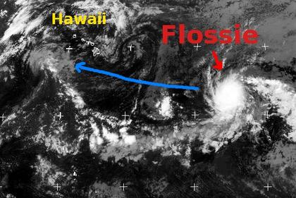 Im Ostpazifik hat sich der Tropensturm 'Flossie' gebildet. Derzeit liegen seine mittleren Windgeschwindigkeiten bei 100 km/h, in Böen werden 120 km/h erreicht. Er zieht nun unter Beibehaltung seiner Stärke ostwärts und wird voraussichtlich am Mittwoch auch die Südspitze von Hawaii treffen. (Bildquelle: NERC Satellite Receiving Station, Dundee University, Scotland, http://www.sat.dundee.ac.uk/)