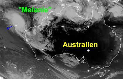 Der Tropensturm 'Melanie' liegt am Sonntag Mittag nordwestlich der Küste von Australien. Seine mittlere Windgeschwindigkeit liegt bei 110 km/h, in Böen bei 140 km/h. Damit erreicht er nur knapp nicht die Einstufung als Zyklon, die in Australien auch Willy-Willy genannt werden. 'Melanie' wird in den nächsten Tagen wohl nach Südosten weiterziehen, sich dabei leicht abschwächen und bewohntes Gebiet damit verschonen. (Bildquelle: NERC Satellite Receiving Station, Dundee University, Scotland, http://www.sat.dundee.ac.uk/)