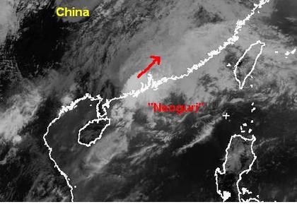 Der ehemalige Taifun 'Neoguri' hat sich zum Tropensturm abgeschwächt und die Südküste von China erreicht. Zurzeit erreicht er mittlere Windgeschwindigkeiten von 102, in Böen 130 km/h. Berechnungen zufolge soll er Richtung Nordosten weiter ins Landesinnere Ziehen und sich weiter abschwächen. Auch Hongkong wird voraussichtlich von seinen Ausläufern beeinflusst werden. Neben Sturm ist auch mit sehr starkem Regen zu rechnen. (Bildquelle: NERC Satellite Receiving Station, Dundee University, Scotland, http://www.sat.dundee.ac.uk/)
