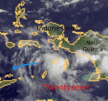 Über Indonesien, westlich der Insel Neuguinea, liegt heute ein Tropensturm namens 'Twentyseve'. Er weist mittlere Windgeschwindigkeiten von 75 km/h auf, in Böen werden 95 km/h erreicht. Damit ist er nicht besonders gefährlich. 'Twentyseve' zieht nach Südwesten weiter und überquert dabei einige der zahlreichen indonesischen Inseln mit einigem Regen. Der Wirbelsturm könnte sich nach aktuellen Berechnungen in den nächsten Tagen noch etwas verstärken.