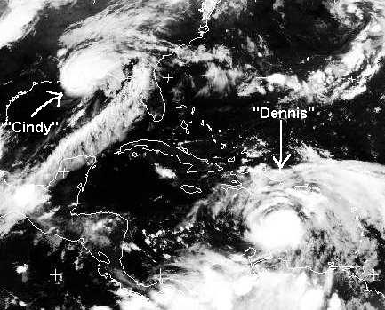 Der tropische Sturm 'Cindy' trifft heute auf die Küste von Louisiana und sorgt hier für kräftige Regenfälle und stürmischen Wind. Ein weiterer Sturm mit dem Namen 'Dennis' entwickelt sich über dem Karibischen Meer und zieht unter Verstärkung nach Nordwesten, im Laufe der Woche überquert er mit Windgeschwindigkeiten von 150 bis 190 km/h Jamaika, Haiti und Kuba, zu Beginn der nächsten Woche wird er im Golf von Mexiko erwartet.