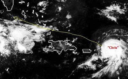 Der tropische Sturm 'Chris' zieht weiterhin auf die Gebiete zwischen den Bahamas und Kuba zu. Derzeit zeichnen ihn Spitzenwindgeschwindigkeiten von knapp 110 km/h aus. 'Chris' soll sich nun auf seinem weiteren Weg weiter verstärken. Allerdings nur auf Windgeschwindigkeiten bis 130km/h. Ein größeres Problem könnten die Regenmengen werden.