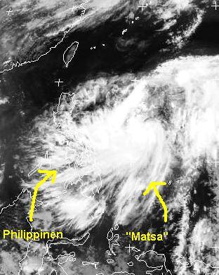 Östlich der Philippinen hat sich ein neuer tropischer Sturm mit Namen 'Matsa' entwickelt. Zur Zeit erreicht er Windgeschwindigkeiten von 90, in Böen 120 km/h. Berechnungen zufolge verlagert er sich in den nächsten Tagen nach Norden ins Ostchinesische Meer und verstärkt sich dabei zu einem Taifun.