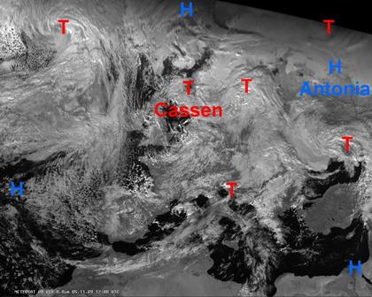 Auf dem Satellitenfoto von heute Nachmittag zeigt sich Europa durch Tiefdruckeinfluss überwiegend stark bewölkt oder bedeckt. Verbreitet kommt es zu Schauern, örtlich entwickeln sich auch kurze Gewitter. In Skandinavien und nach Osteuropa fällt teils auch Schnee. Freundlicher und meist trocken ist es im östlichen Mittelmeerraum sowie im westlichen Russland. Am Schwarzen Meer sorgt ein Tiefdruckgebiet für teils kräftige Schauer oder Gewitter.
