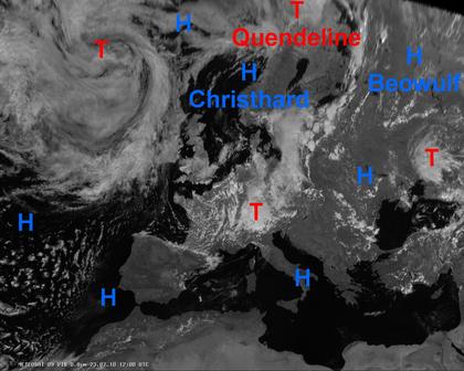 Auf dem Satellitenfoto von heute Nachmittag ist ein Tiefdruckgebiet über Mitteleuropa zu sehen, dass von Frankreich, über Benelux, Deutschland, die Alpenländer und bis in die Ostsee für vielfach sehr wechselhaftes und meist eher kühles Schauerwetter sorgt. Weitere Tiefdruckgebiete über dem Norden von Skandinavien und nordöstlich des Schwarzen Meers bringen ebenfalls vielfach dichte Wolken und häufig Schauer, teils auch Gewitter. Sonst liegt Europa allerdings überwiegend unter Hochdruckeinfluss mit sehr trockenem und freundlichem Wetter, dazu ist es in Südeuropa teils auch sehr heiss.