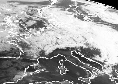Von Nordwesten strömt weiter feuchte und kühle Luft nach Mitteleuropa. Dabei bildet sich eine fast geschlossene Wolkendecke. Südlich der Alpen bleiben Wolken dagegen eine Seltenheit. Die Wolkenlücken über der Nordsee können heute unter leichtem Zwischenhocheinfluss aber auch ein wenig in den Nordwesten Deutschlands vordringen. (Bildquelle: NERC Satellite Receiving Station, Dundee University, Scotland, http://www.sat.dundee.ac.uk/)
