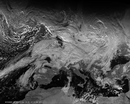 Auf dem heutigen Satellitenfoto sind vom mittleren bis zum nördlichen Europa verbreitet dichte Wolken zu beobachten, hierbei gelangen häufig atlantische Tiefausläufer mit vielfach feuchten Luftmassen auf das europäische Festland. Freundlicher und meist trocken ist es dagegen am Mittelmeer und am Schwarzen Meer, vor allem im östlichen Mittelmeer muss allerdings gebietsweise mit Schauern und Gewittern gerechnet werden.