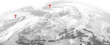 Die Tiefdruckgebiete 'Rosa' bei Schottland und 'Tina' auf dem Atlantik bringen heute und in den nächsten Tagen wechselhaftes Wetter und teils stürmischen Wind nach Europa. Dabei wird aus Süden milde Luft herangeführt. (Bildquelle: NERC Satellite Receiving Station, Dundee University, Scotland, http://www.sat.dundee.ac.uk/)