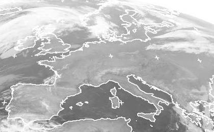Der Hochdruckeinfluss sorgt weiterhin für nur wenige Wolken in weiten Teilen Europas. Tiefausläufer mit ihren Wolken ziehen im Norden am Hoch vorbei. Vereinzelt lag am Vormittag jedoch hier kaum zu erkennender Hochnebel über Deutschland. (Bildquelle: NERC Satellite Receiving Station, Dundee University, Scotland, http://www.sat.dundee.ac.uk/)