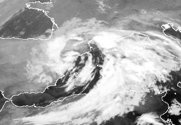 Das Tief 'Rudi' über dem Mittelmeer und seine Kaltfront reicht bis nach Nordafrika. Es hat sich wieder etwas verstärkt und bringt heute wieder dichte Wolken und kräftige Schauer und Gewitter nach Südfrankreich, Spanien und Italien.