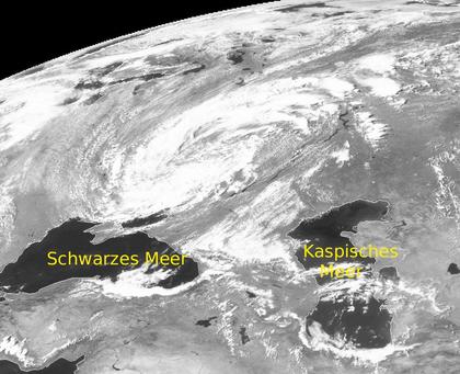 Ein gut ausgeprägter Wolkenwirbel eines Tiefdruckgebietes zeigt sich im Satellitenbild von Freitag Mittag nördlich des Schwarzen Meers über der Urkaine. Während es sonst in Südost- und Osteuropa meist trocken und sehr warm ist, bringen die Schauer und Gewitter unter den Wolken Abkühlung. (Bildquelle: Copyrigt EUMETSAT, NERC Satellite Receiving Station, University of Dundee)