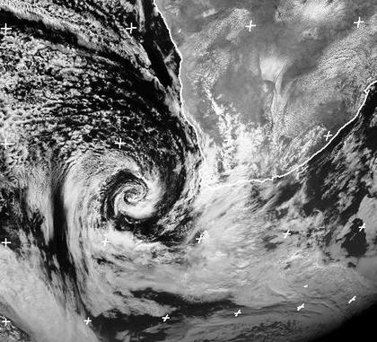 Westlich der Südspitze des afrikanischen Kontinents liegt ein Tiefdruckwirbel. Sein Frontensystem ist bereits okkludiert. Die Wolken der Okklusion liegen über dem Kapland Südafrikas und bringen dort etwas Regen.