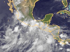 Auf dem Satellitenbildausschnitt von Mittelamerika sind von Mexiko im Norden bis in den südlichsten Staat von Mittelamerika, nach Panama, zahlreiche Gewitterzellen zu erkennen.