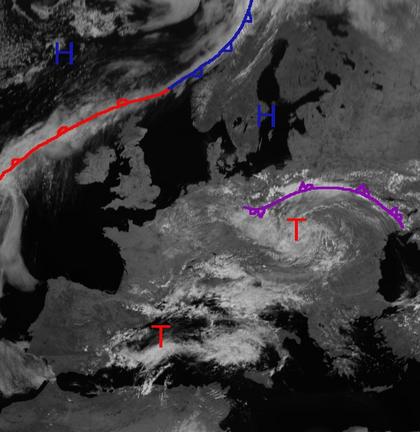Hoch 'Zusanna' über Südskandinavien sorgt für meist sonniges Wetter von Spanien bis zu den Britischen Inseln und bis nach Russland. Weiter im Nordwesten liegt eine Tiefdruckrinne mit der zugehörigen Bewölkung. Über Südosteuropa ist es unter dem Einfluss von Tief 'Hajo' und einem Tief am westlichem Mittelmeer ebenfalls häufig stärker bewölkt, hier kommt es zu einigen Schauern und Gewittern. Ausläufer des Tiefs ziehen mit ihren Wolken in den nächsten Stunden von Osten teilweise bis nach Deutschland hinein und bringen auch hier Schauer und Gewitter.