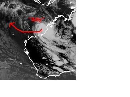 Die dichten Wolken an der Nordwestküste Australiens gehören zu dem Zyklon 'Billy', der sich dort vor einigen Tagen aufgewirbelt hat. Zurzeit erreicht er mittlere Windgeschwindigkeiten von 74, in Böen 102 km/h. Berechnungen zufolge soll er sich erst mal nicht weiter verstärken und Richtung Westen auf den Indischen Ozean hinausziehen. Sein Endziel ist allerdings noch unklar. (Bildquelle: NERC Satellite Receiving Station, Dundee University, Scotland, http://www.sat.dundee.ac.uk/)