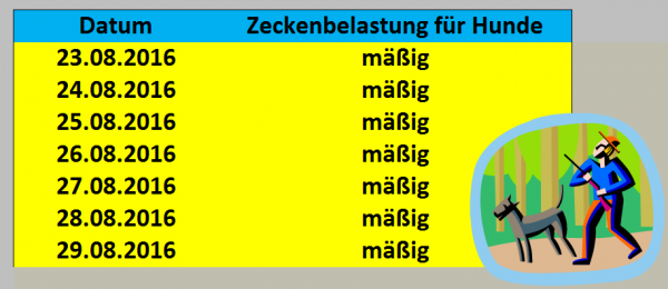 Selbst in den besonders risikoreichen Zeckenregionen im Südwesten des Landes sind in den nächsten Tagen nur höchstens mäßige Konzentrationen zu verzeichnen. Dem weitgehend sorglosen Spaziergang mit Ihrem Vierbeiner steht in dieser Woche also nicht viel im Weg!