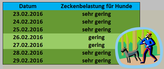 Meist einstellige Werte am Tag und regionale Frostnächte machen den Blutsaugern im Unterholz nämlich das Leben schwer. Dementsprechend ist in dieser Woche nur mit einer sehr geringen bzw. geringen Hundezecken-Belastung zu rechnen.