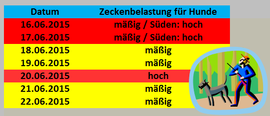 Kühles Wetter bremst die Hundezecken im Norden und in der Mitte. Im Süden bestehen durch Niederschläge und milde Temperaturen hohe Risiken.