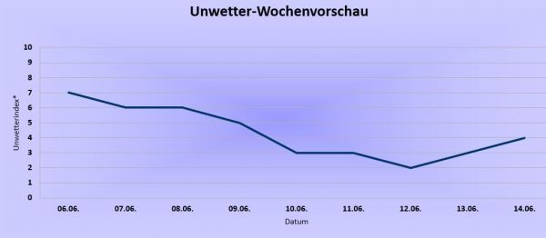 In der laufenden Wetterwoche begleiten besonders in den westlichen Landesteilen weitere Schauer und auch Gewitter das Wettergeschehen. Dabei sind hier regional auch schwere Gewitter mit Starkregen, einzelnen Sturmböen und Hagel möglich. In den anderen Regionen sind Gewitter ebenfalls nicht auszuschließen, jedoch unwahrscheinlicher. Im Laufe der Woche nimmt das Gewitterpotenzial langsam weiter ab, d.h. dass bundesweit weitere Schauer und Gewitter entstehen können, die Intensität der Gewitter voraussichtlich jedoch niedriger bleibt.