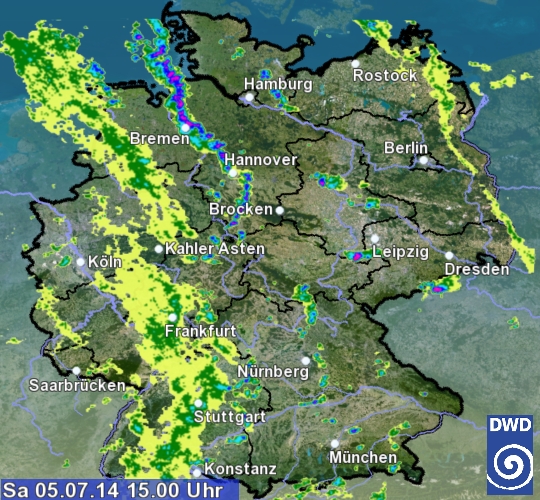 Auf dem Radarbild von 15 Uhr ist eine Linie starker Gewitter und Schauer zu sehen, die sich von der Nordsee bis in den Süden Niedersachsens erstreckt. Diese bewegt sich nach Osten. Im aktuellen Radarfilm kann die Entwicklung beobachtet werden.