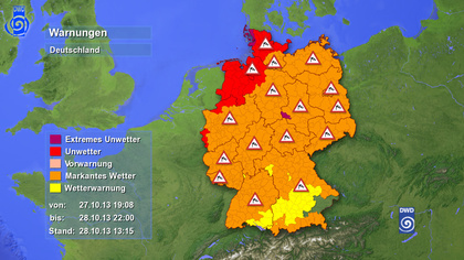 In fast ganz Deutschland sorgt das Orkantief 'Christian' für stürmischen Wind. Die höchsten Windgeschwindigkeiten wurden bis heute Mittag in den Mittelgebirgen gemessen: Über 100 km/h auf den Gipfeln des Thüringer Waldes, des Bayerischen Waldes und des Erzgebirges. Auf dem Feldberg im Schwarzwald wurden sogar 120 km/h registriert, auf dem Brocken 160 km/h.