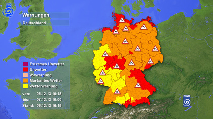 Das Orkantief liegt inzwischen mit seinem Zentrum über der Ostsee und bewegt sich ganz langsam weiter nach Osten. In Westdeutschland hat der Wind schon stark abgenommen, im Flachland wurden in Rheinland-Pfalz und Nordrhein-Westfalen am Nachmittag kaum noch stürmische Böen (Windstärke 7) gemessen. Im Rest des Deutschlands treten immer noch Sturmböen um 70 km/h auf.
