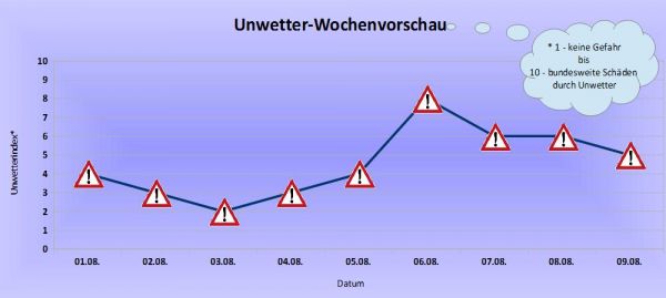 Die Gefahren durch mögliche Unwetter bleiben in der nächsten Wetterwoche, zumindest über weite Strecken des Vorhersagezeitraums, überwiegend gering bis mäßig. Von Montag bis Freitag sind jedoch vor allem im Süden auch örtliche, teils kräftige Gewitter möglich. Am Samstag zeigen die Modelle dann ein sehr starke Gewitterneigung über dem Bundesgebiet, dabei besteht vielerorts auch ein sehr hohes Gewitterpotenzial mit möglichem Starkregen oder Hagel. Auch in den Folgetagen bis in die übernächste Woche sind die Risiken durch Unwetter häufig hoch, jedoch besteht hier noch eine größere Prognoseunsicherheit, da die Tage aus meteorologischer Sichtweise noch deutlich weiter in der Zukunft liegen.