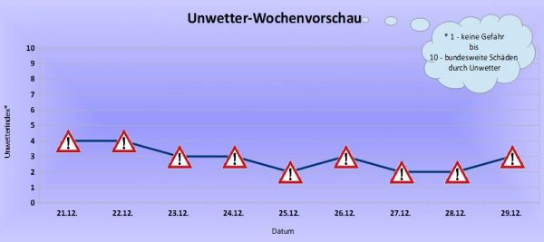 In der neuen Wetterwoche bleiben die Gefahren durch Unwetter zumeist gering. Im Norden und Westen ist jedoch vor allem am Montag und Dienstag ein oft kräftiger und teils auch stürmischer Wind zu erwarten, an den deutschen Küsten herrscht zeitweise auch Sturm. In den Folgetagen bleibt es bevorzugt im Norden auch oft windig, an den Küsten ist es auch zeitweise stürmisch mit möglichen Sturmböen. Eis und Schnee sind indes weiterhin nicht in Sicht, und auch nachts bleibt es weitgehend frostfrei. Nur bei langem Aufklaren in im Süden und Osten hier und da mal leichter Frost möglich.