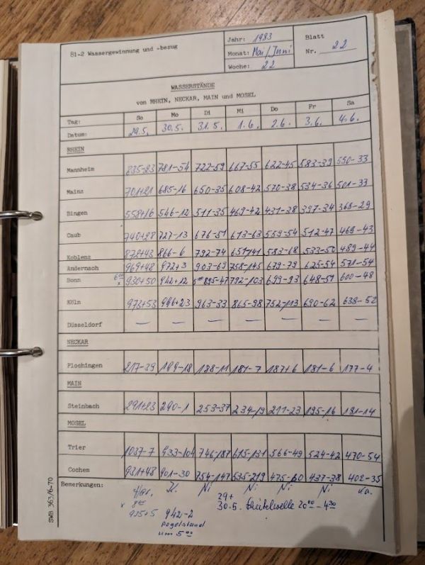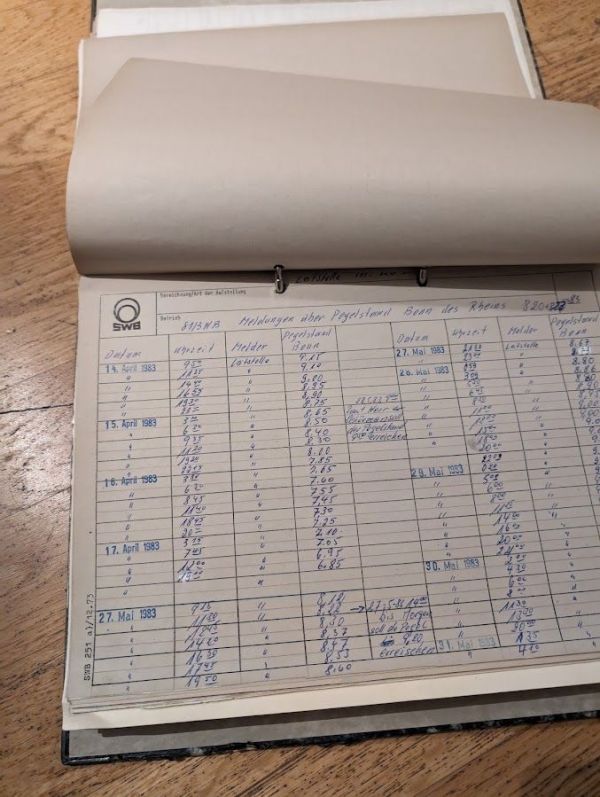 Die Bilder zeigen die originalen Pegelaufzeichungen der Bonner Wasserwerke aus April und Mai 1983 mit allen wichtigen Rhein- und Moselpegeln.