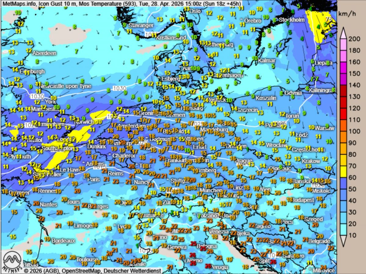 Die Wetter- und Temperaturkarte sowie die Böenkarte (10 m) für Dienstagnachmittag (15 Uhr) nach ICON: